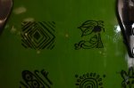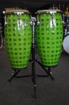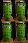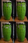 Theses congas are made out of Oak & sound great. Hardware is all polished steel. There are a few scratches and scuffs here and there. The biggest issue is the crack by one of the lugs on the biggest conga. All damage/imperfections can be seen above. Comes with the stand.