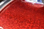 We removed the contact paper, sanded the shells, repainted the interior (in the proper Benjamin Moore white) and rewrapped with Delmar red sparkle wrap that we had on hand. hoops were refinished and fresh matching inlay added.